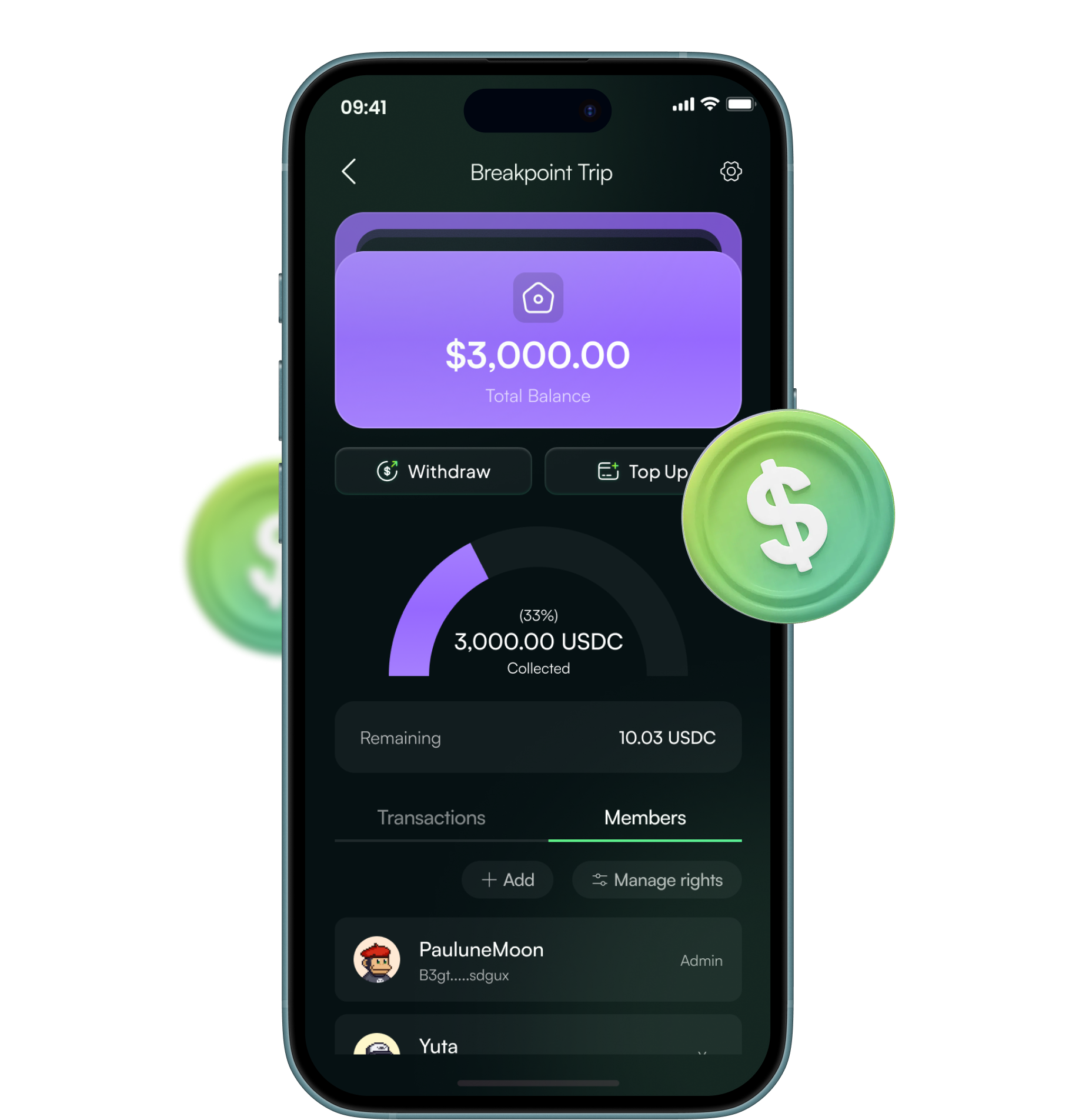 Pool funds into one shared wallet and spend together for trips, events, group buys, or DAOs.